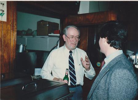 Everett Henderson on the right, and Lee Wittwer is grinning back toward the left... I see an Olympia beer sign behind Lee. Oly was the lighter beer served by the M&M. Coors, because of its non-union practices, was not stocked at the M&M. Outside the bar somebody -- Not an M&M employee! They'd never deface public property! -- had stenciled "Boycott Coors Beer" on both Howard and 5th Street sidewalks.